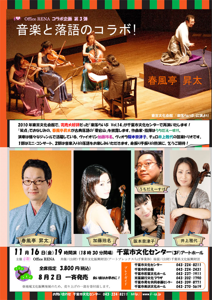 春風亭昇太、うちだえーすけ(作曲家・指揮)、加藤玲名(ヴァイオリン)、阪本奈津子(ヴィオラ)、井上雅代(チェロ)