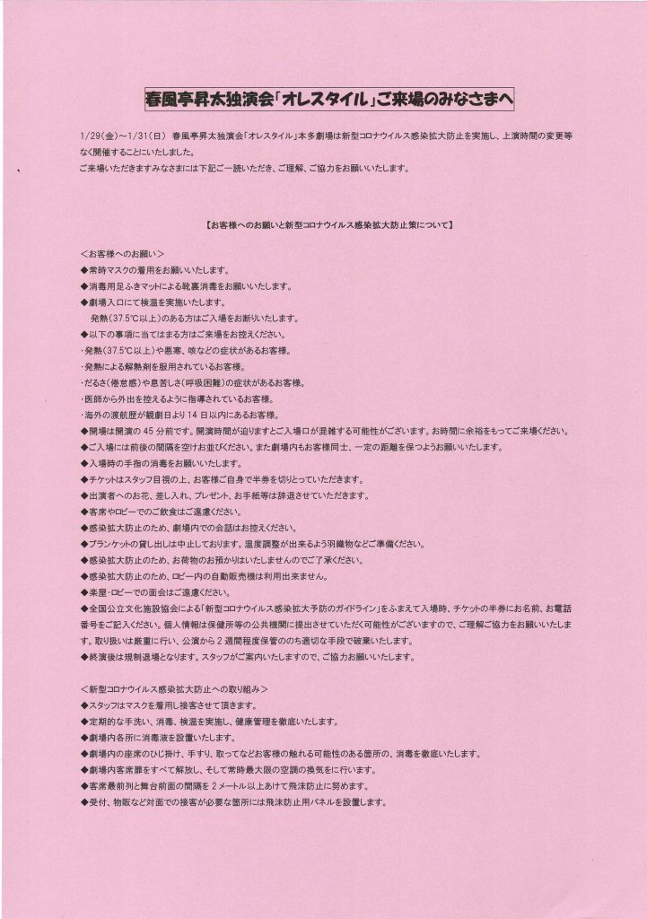 1/26更新 ご来場のみなさまへのお願い、新型コロナウイルス感染拡大防止策について 1/20更新 緊急事態宣言を受け協議を重ねました結果、 春風亭昇太独演会「オレスタイル」は新型コロナウイルス感染拡大予防対策を施した上で、開演時間の変更等なく予定通り開催することにいたしました。 今後の状況により変更など生じる場合は春風亭昇太ホームページにてご案内いたします。 最新の情報をご確認いただきご来場いただきますよう、よろしくお願いいたします。 【注意事項】 ※座席間隔を保つため、左右1席づつ空けて販売いたします。 ※2名でご来場の場合、ご同行者様でも間隔を空けてお座りいただきますのでご了承ください。 ※全国公立文化施設協会による「新型コロナウイルス感染拡大予防のガイドライン」をふまえ、事前にチケットの半券(入場時に切り取る右側の小さい方)の裏面に、お名前とお電話番号をご記入ください。 ※ご来場、ご観劇時の常時マスク着用をお願いいたします。 |